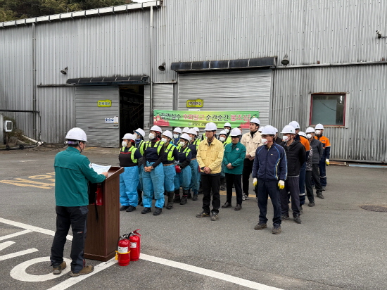 재활용선별장 스티로폼 처리시설에서의 화재 상황을 가정해 실제처럼 진행됐으며 초기 대응과 근로자 대피 절차를 집중 점검하는 한편 화재 원인 분석과 예방수칙 교육도 병행했다.