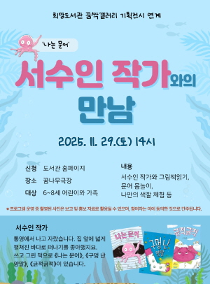 (전남=NSP통신) 김성철 기자 = 광양희망도서관은 오는 11월 29일 3층 꿈싹갤러리에서 현재 성황리에 운영 중인 기획전시 ‘그림책이 반짝, 친구가 되는 순간’과 연계해 ‘나는 문어’의 저자 서수인 작가와의 만남 행사를 진행한다고 밝혔다.