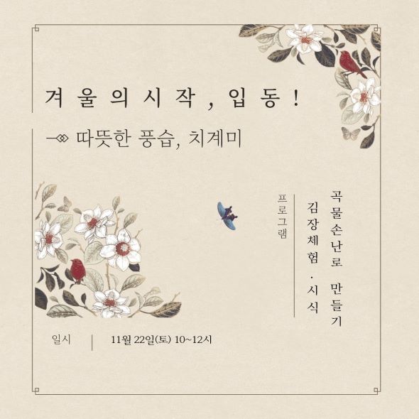 특히 가족 단위 참가자들이 김치를 함께 담그고 친환경 재료로 손난로를 만드는 시간을 통해 따뜻한 겨울의 정취와 세시문화의 의미를 함께 느낄 예정이다.