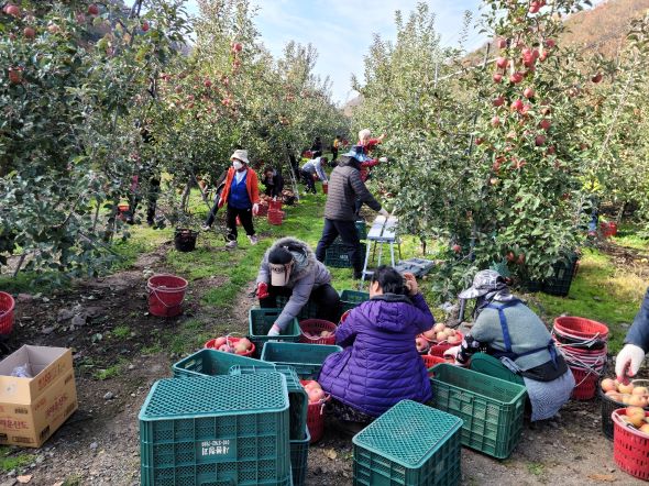 사과 수확하고 운반하는 작업 진행하며 농가의 시름 덜어