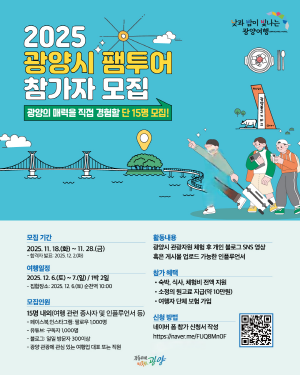 (전남=NSP통신) 김성철 기자 = 광양시가 낮과 밤이 빛나는 광양의 매력적인 관광자원을 직접 체험하고 감각적인 콘텐츠로 널리 홍보할 영향력 있는 ‘2025 G-관광 팸투어’ 참가자를 모집한다.