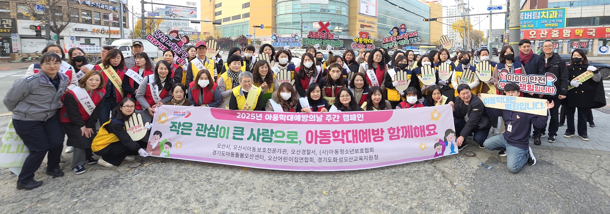 캠페인에는 오산시를 비롯해 ▲오산시아동보호전문기관 ▲오산경찰서 ▲아동청소년보호협회 오산시지회 ▲오산어린이집연합회 ▲경기도아동돌봄오산센터 ▲경기도화성오산교육청 등 다양한 기관이 참여했다.