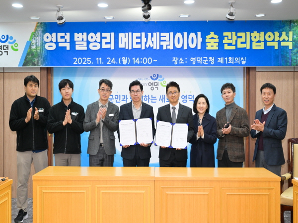 (경북=NSP통신) 조인호 기자 = 영덕군은 지역 관광명소로 자리매김한 영해면 벌영리 메타세쿼이아 숲의 지속 가능한 운영·관리와 효과적인 활용을 위해 숲 소유주 장명진 대표와 협약을 체결했다.