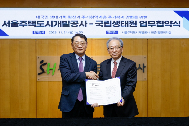 (서울=NSP통신) 강은태 기자 = 서울주택도시개발공사(사장 황상하, 이하 SH)와 국립생태원은 대국민 생태 가치 확산과 주거 복지 강화를 위해 지난 24일 업무협약(MOU)을 체결했다고 25일 밝혔다.