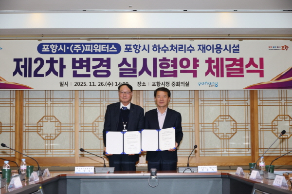 (경북=NSP통신) 조인호 기자 = 포항시는 26일 하수처리수 재이용시설 민간투자사업의 안정적 운영 기반을 강화하기 위한 제2차 변경 실시협약 체결을 성공적으로 마무리했다.