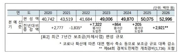 같은 기간 정부예산 증가율 19.8%보다 7.2%P 높고 도내 기초지자체의 최근 3년간(2022-2025) 평균 인 20.4%를 크게 웃도는 수준이다.