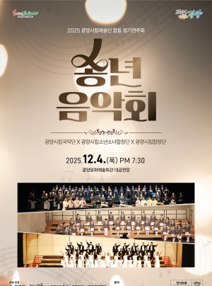 (전남=NSP통신) 김성철 기자 = 광양시는 연말을 맞아 오는 12월 4일 오후 7시 30분 광양문화예술회관 대공연장에서 2025년 광양시립예술단 합동 정기연주회 ‘송년음악회’를 개최한다고 밝혔다.