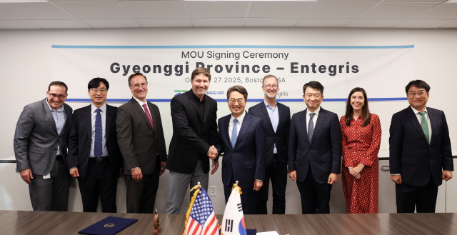 NSP통신-2025년 10월 미국 보스턴에서의 인테그리스 투자협약 체결 기념촬영 모습. (사진 = 경기도)