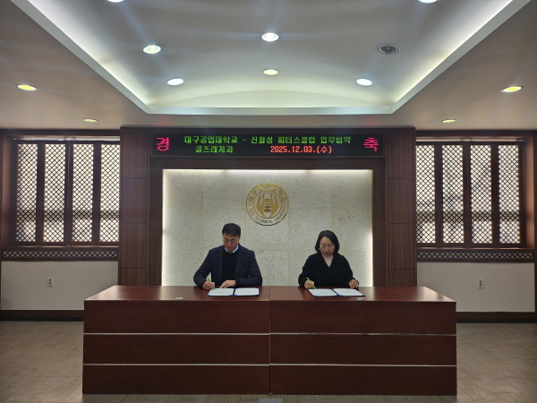 (경북=NSP통신) 김대원 기자 = 지난 3일 대구공업대학교(총장 이별나) 골프레저과와 피터스클럽 신월성점(대표 박정태)간 학과 맞춤형 활동 상호발전을 위한 공동업무 협약을 본 대학에서 체결했다.
