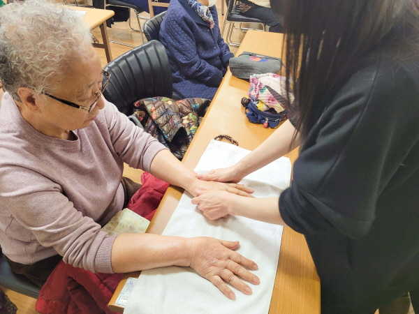 봉사단은 섬세한 손길로 어르신들의 지친 피부와 두피를 정성껏 보살폈으며 특히 따뜻한 손 마사지로 어르신들의 혈액 순환을 돕고 정서적 교감을 나눴다.