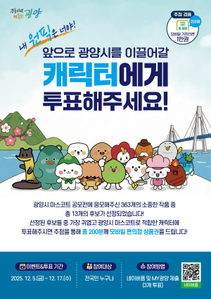 투표는 전 국민 누구나 참여할 수 있으며 광양시를 상징할 수 있고 시민에게 친근함과 호감을 줄 수 있는 캐릭터 3개를 선택해 제출하면 된다. 참여 방법은 포스터 하단의 네이버폼 QR코드 스캔 또는 ‘MY광양’앱 접속을 통해 간편히 참여할 수 있다.