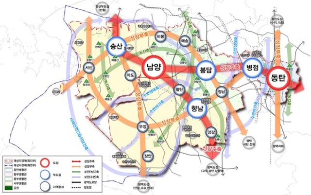 ‘2도심’은 남양과 동탄으로 주요 도시 기능을 담당하는 시청이 위치한 행정 거점 ‘남양’과 경제·산업·교통 등 시의 전반적인 경제성장을 견인하는 ‘동탄’으로 설정됐다. 이를 통해 인접 시군간 광역적 연계와 동서간 균형발전을 도모한다는 계획이다.