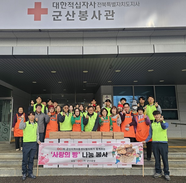 (전북=NSP통신) 김광석 기자 = OCI 군산공장(공장장 심재엽, 노동조합위원장 장육남)과 군산희망틔움봉사단이 11일 연말을 맞아 지역 취약계층과 군산지역아동센터를 위해 ‘사랑의 빵’ 1600개(약 300만원 상당)를 만들어 전달하는 나눔 활동을 진행했다.