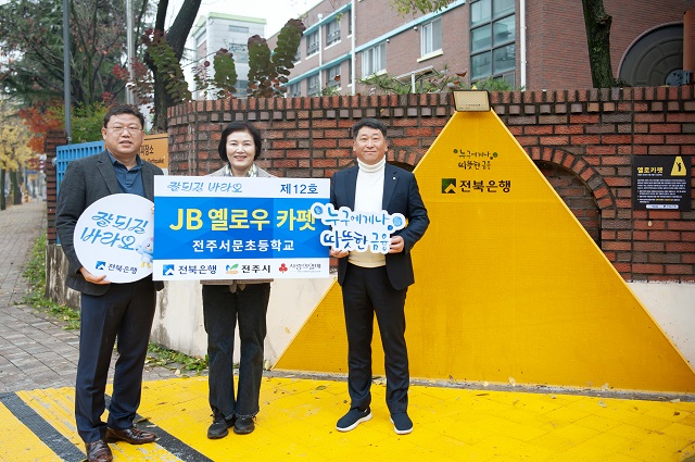 전북은행은 전주시와 협의를 통해 골목진입 및 우회 차량이 많은 초등학교 앞 횡단보도에 내구성과 시인성이 우수해 반영구적으로 사용할 수 있는 ‘JB옐로우 카펫’을 조성했다. 이를 통해 사고 가능성이 잠재된 생활도로 구간에서 운전자가 대기 중인 아동들을 빠르게 인식할 수 있는 환경개선이 이뤄졌다.