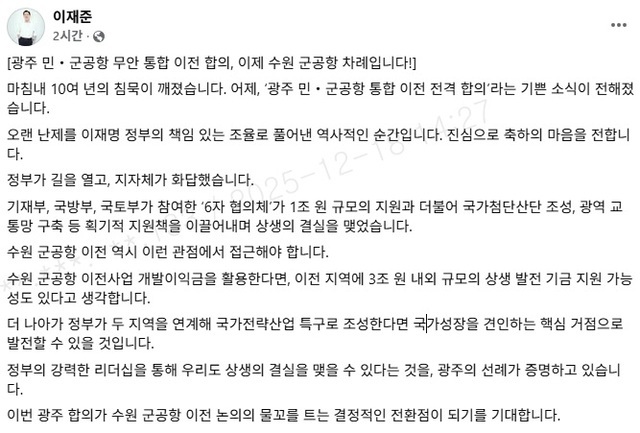 이어 “정부의 강력한 리더십으로 수원 군공항 이전도 상생의 열매를 맺을 수 있다는 것을 광주의 선례가 증명하고 있다”고 밝혔다.