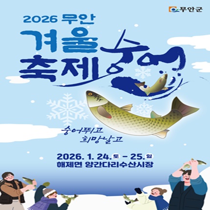 (전남=NSP통신) 오환주 기자 = 무안군(군수 김산)은 겨울철 최고의 별미로 꼽히는 숭어를 소재로 한 ‘2026 무안겨울숭어축제’를 오는 1월 24일(토)부터 25일(일)까지 이틀간 해제면 주민다목적센터와 양간다리수산시장 일원에서 개최한다.