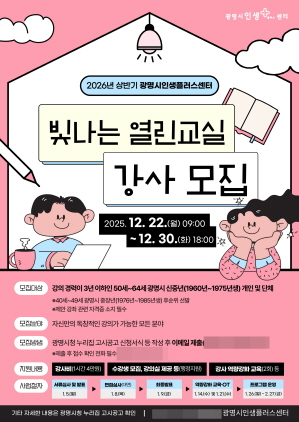 (경기=NSP통신) 김여울 기자 = 경기 광명시(시장 박승원)는 오는 30일까지 ‘2026년 상반기 빛나는 열린교실’에 참여할 신중년 아마추어 강사를 모집한다.