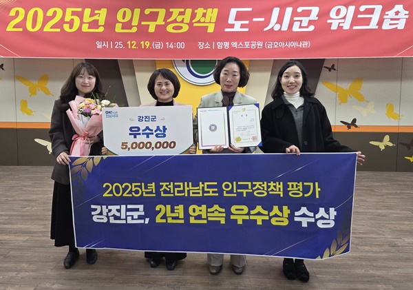 (전남=NSP통신) 김용재 기자 = 강진군이 전남도가 실시한 2025년 인구정책 우수 시·군 평가에서 ‘우수상’을 수상했다.