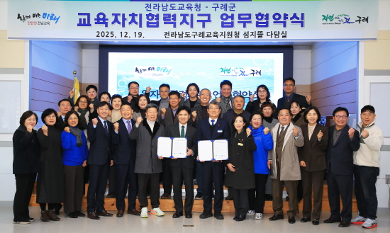(전남=NSP통신) 김성철 기자 = 구례군은 지난 19일 구례교육지원청 섬지뜰 다담실에서 전라남도교육청(교육감 김대중), 구례교육지원청, 구례군의회, 학교장, 민관산학위원, 학부모연합회 등 50여 명이 참석한 가운데‘구례교육자치협력지구’업무협약을 체결하였다고 밝혔다.