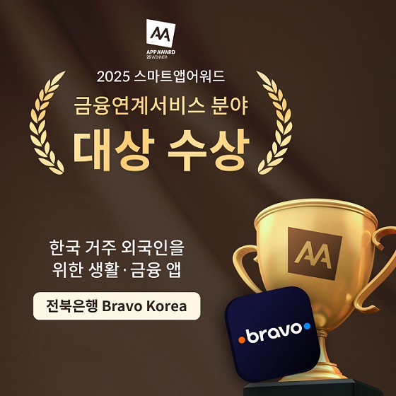(전북=NSP통신) 김광석 기자 = JB금융그룹 전북은행은 외국인 특화 금융·생활 플랫폼 ‘Bravo Korea(브라보 코리아)’가 스마트앱어워드에서 금융부분 금융연계서비스 분야 대상을 수상했다고 밝혔다.