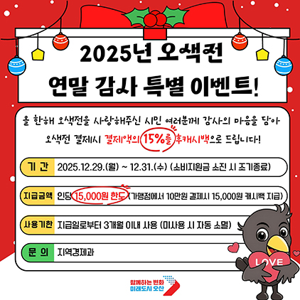(경기=NSP통신) 조현철 기자 = 경기 오산시(시장 이권재)가 한 해 동안 지역화폐를 이용해 준 시민들에게 감사의 뜻을 전하고 연말 소비 활성화를 위해 ‘2025년 오색전 연말 감사 특별 이벤트’를 추진한다.