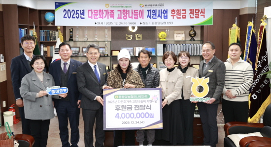 (전남=NSP통신) 김성철 기자 = 동광양농협(조합장 이돈성)은 지난 24일 ‘다문화가정 여성 고향 보내주기’ 사업을 위한 후원금 전달식을 열고 지역사회에 따뜻한 나눔의 의미를 전했다.