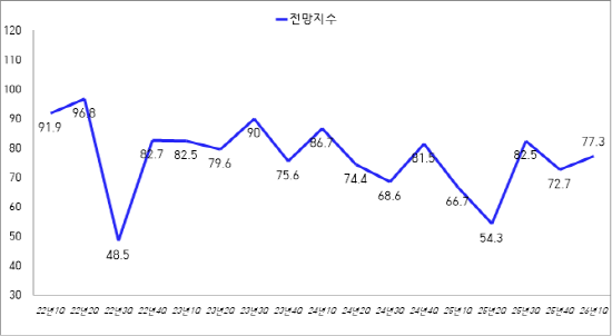 이번 전망지수(77.3P)는 2025년 4/4분기(72.7P) 대비 4.6P 증가하였으나, 17분기(22년1분기~26년1분기) 연속 100 이하를 기록햇다.(전국 기준 77.3P, 전남 기준 97.6P)