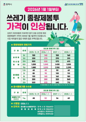 (경기=NSP통신) 김병관 기자 = 경기 평택시(시장 정장선)는 2026년 1월 1일부터 쓰레기 종량제 봉투 가격을 3개년도에 걸쳐 인상한다.