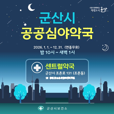 공공심야약국(센트럴약국, 군산시 조촌로 131)은 오후 10시부터 다음날 새벽 1시까지 365일(연중무휴) 운영되며 심야시간대에도 약사와의 상담을 통해 안전한 의약품 복용이 가능하도록 지원하고 있다.