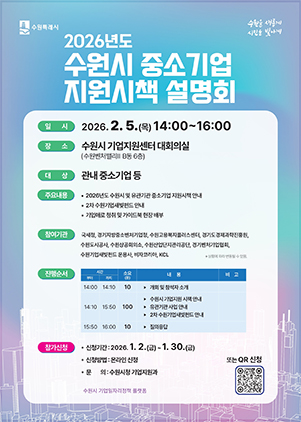 ‘2026년 중소기업 지원시책 설명회’는 2월 5일 오후 2시부터 4시까지 수원시 기업지원센터 대회의실에서 열린다.