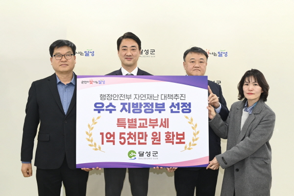 지난해 12월 달성군은 행정안전부 주관 ‘재난대응 안전한국훈련’에서 3년 연속 ‘우수 등급’을 획득한 데 이어 자연재난 대책추진(호우) 분야에서 ‘우수기관’으로 선정되어 특교세 1억5천만 원을 확보했다. 또한 대구시 주관 자연재난 관리실태 평가에서도 ‘우수기관’으로 선정되며 재난 대응 분야 3관왕을 달성했다.