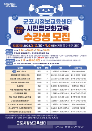 (경기=NSP통신) 정희순 기자 = 경기 군포시(시장 하은호)는 시민들의 정보화 시대에 대한 적응 능력 향상 및 정보 소외 계층의 디지털 격차 해소를 위해 운영되는 ‘2026년 1기 시민정보화교육’의 수강생을 오는 14일부터 18일까지 모집한다.