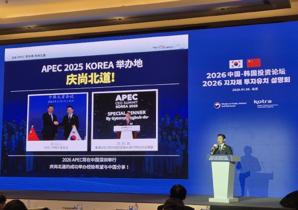 (경북=NSP통신) 조인호 기자 = 경상북도는 지난 6일 중국 베이징에서 열린 산업통상부 주관 지자체 투자유치 설명회에 참가해 중국 기업과 투자자를 대상으로 경상북도의 투자환경과 미래 협력 전략을 집중적으로 소개했다.