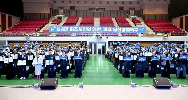 파주시민회관 대공연장에서 개최된 이번 행사는 김경일 파주시장을 비롯해 주요 내빈과 평화경제특구 유치 시민추진단, 시민 등 200여 명이 참석한 가운데 진행됐다.