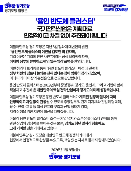 경기도당은 이날 발표한 입장문을 통해 “8일 청와대 대변인이 ‘용인 반도체 클러스터 이전을 검토한 바 없으며 기업 이전은 기업의 판단 사안’이라고 공식 브리핑한 데 대해 이재명 정부의 분명하고 책임 있는 입장 표명으로 평가하며 환영의 뜻을 밝힌다”고 전했다.