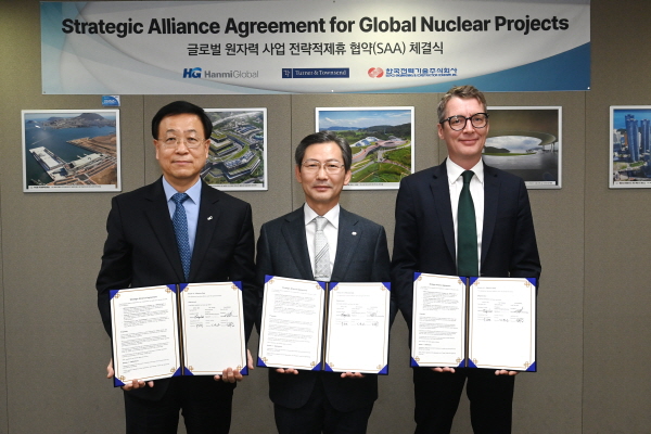 (경북=NSP통신) 김대원 기자 = 한국전력기술(사장 김태균, 이하 ‘한전기술’)은 지난 8일 Turner & Townsend (이하 ‘T&T’) 및 한미글로벌과 해외 원전 사업을 위한 ‘전략적 제휴 협약(Strategic Alliance Agreement)’을 체결했다.