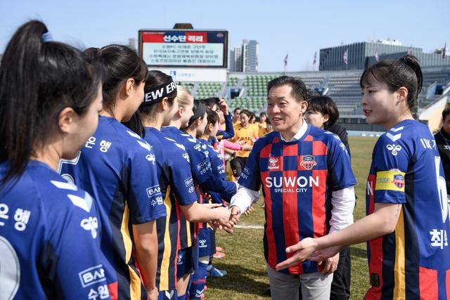 이재준 수원시장(오른쪽 두번째)이 수원FC위민 선수단을 격려하고 있다. (사진 = 수원시)