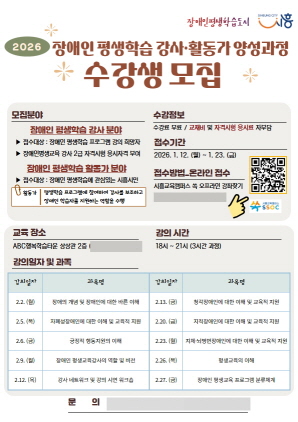 (경기=NSP통신) 김여울 기자 = 경기 시흥시(시장 임병택)는 오는 23일까지 ‘2026년 장애인 평생학습 전문 강사와 활동가 양성 과정’ 수강생을 모집한다.
