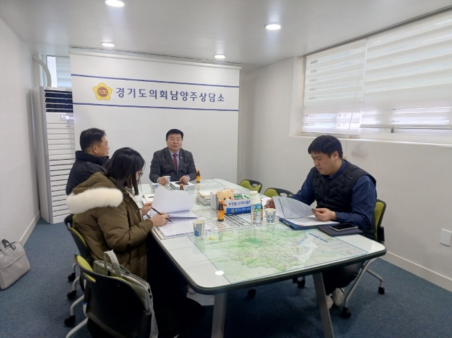 이병길 경기도의원(왼쪽 세번째)이 13일 도의회 남양주상담소에서 경기도 응급의료과 관계자들과 ʻ경기도 필수의료 강화와 지역의료 격차 해소를 위한 조례(안)ʼ에 대해 논의하고 있다. (사진 = 경기도의회)