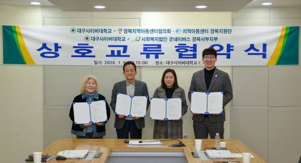 이날 대구사이버대학교는 경북지역아동센터협의회 및 지역아동센터 경북지원단과 3자 협약을 체결한 데 이어 굿네이버스 경북서부지부와도 협약을 맺으며 지역사회 복지와 교육 지원을 위한 협력 체계를 한층 강화했다.