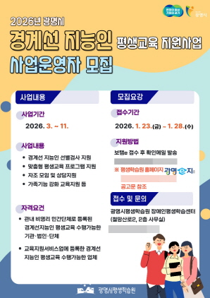 (경기=NSP통신) 김여울 기자 = 경기 광명시(시장 박승원)는 ‘2026년 광명시 경계선지능인 평생교육 운영 지원사업’을 수행할 보조사업자를 오는 28일까지 공개 모집한다.