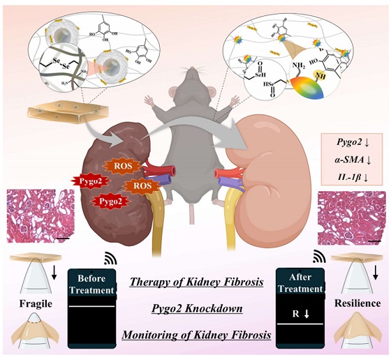 연구팀은 신장 섬유화 부위에서 과도하게 생성되는 활성산소(ROS)에 반응해 물리·화학적 변형이 일어나는 하이드로겔을 설계하고 여기에 Wnt/β-catenin 신호전달 경로의 핵심 인자인 Pygo2 유전자를 억제하는 shPygo2를 탑재했으며 해당 하이드로겔은 병변 부위의 산화 스트레스 환경을 감지해 선택적으로 유전자를 방출함으로써 치료 효율을 극대화한다.