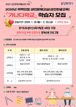 (경기=NSP통신) 조현철 기자 = 경기 화성시(시장 정명근)가 19일부터 2월 20일까지 2026년 성인을 위한 한글교실 ‘가나다학교’ 및 ‘늘배움학교’ 수강생을 선착순 모집한다.