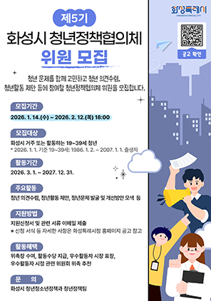 이병희 청년청소년정책과장은 “청년정책협의체는 청년이 정책의 수혜자를 넘어 정책의 주체로 참여하는 중요한 창구”라며 “청년의 다양한 경험과 의견이 모여 더 나은 화성의 미래를 함께 만들어갈 수 있도록 많은 관심과 참여를 바란다”고 말했다.