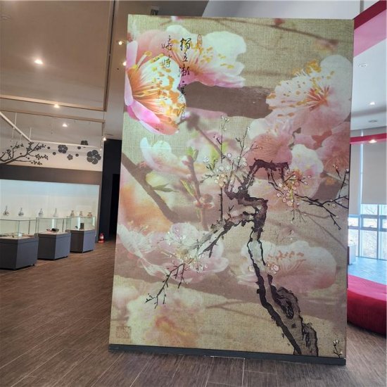 이이남 작가의 ‘광양매화의 빛’은 매화 그림 위 빔프로젝터 맵핑으로 꽃잎이 흩어지고 모이는 장면을 구현한 작품으로 광양 매화의 생명력과 순환의 이미지를 빛으로 표현했다.