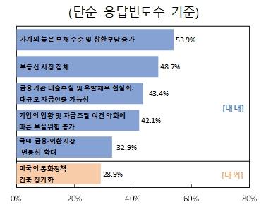This survey showed that the experts indentified the high level of household debts and growing burdens of debt repayment (53.9%), stagnant real estate market (48.7%), financial institutions' loan defaults and contingent liabilities and possibility of large-scale fund withdrawals (43.4%) are the major internal risk factors in the Korean financial system, while citing prolonged US fiscal austerity (28.9%) as an external risk factor.