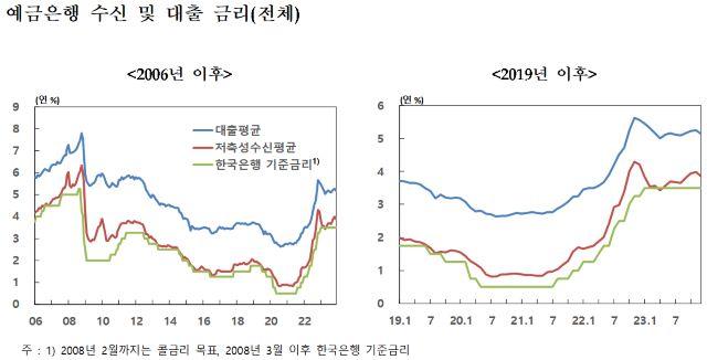 31日、韓国銀行が発表した「2023年12月金融機関加重平均金利」によると、12月中に新規取り扱い額基準の貯蓄性受信金利は年3.85%で、前月対比0.14%p下落した。貸出金利は年5.14%で前月比0.12%p下落した。