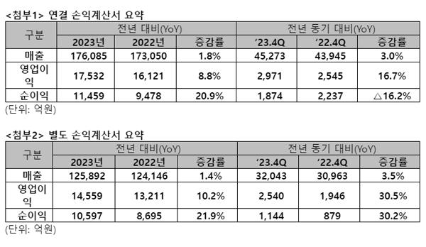 これはそれぞれ前年比1.8%、8.8%増加し、純利益は1兆1,459億ウォンを記録した。別途基準では売上12兆5892億ウォン、営業利益1兆4559億ウォン、純利益1兆597億ウォンだ。