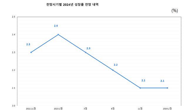 昨年11月に提示した従来の予測値は維持された。 韓国銀行は昨年11月、今年の実質国内総生産(GDP)成長率の展望値を2.1%と提示した。来年の成長率は2.3%と見込んだ。