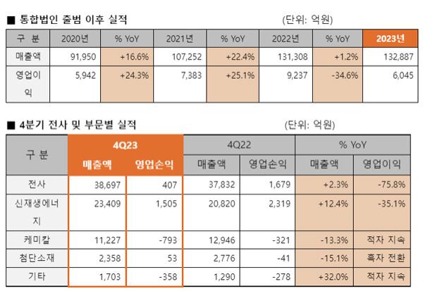 (Seoul=NSP NEWS AGENCY) = ハンファソリューションは2023年に連結ベースで売上高13兆2887億ウォン(約1兆5010億円)、営業利益6045億ウォン(約682億円)をそれぞれ記録したと発表した。前年同期比で売上高は1.2%増加し、営業利益は34.6%減少した。